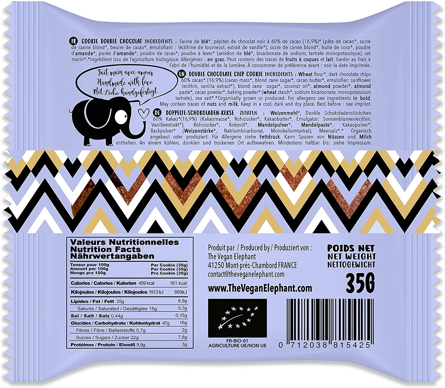 The Vegan Elephant Cookies sont issus d'une fabrication artisanale à partir d’ingrédients 100% Bio & Vegan de la plus haute qualité, choisis avec le plus grand soin, sans huile de palme ni OGM. Nous utilisons de la farine française de 1ère gamme, du sucre blond de canne, du chocolat noir supérieur, des amandes sous diverses formes, de l’huile de noix de coco des Philippines, de la vanille de Madagascar, une pointe de sel de Méditerranée et une touche de poudre à lever pour des cookies plein de saveur et de légèreté.