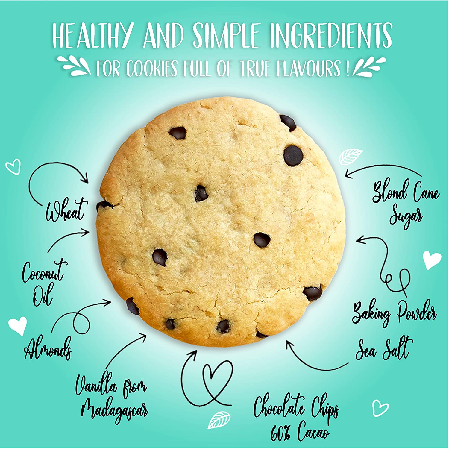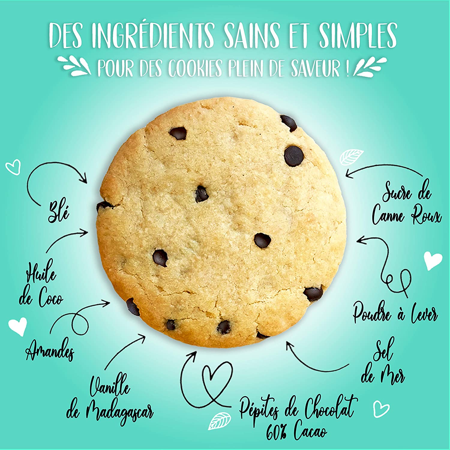 ✨ DES INGRÉDIENTS SAINS ET SIMPLES : Farine de blé, pépites de chocolat noir 60% de cacao, sucre de canne blond, huile de coco, poudre et purée d’amande, poudre à lever, sucre vanillé, sel marin.