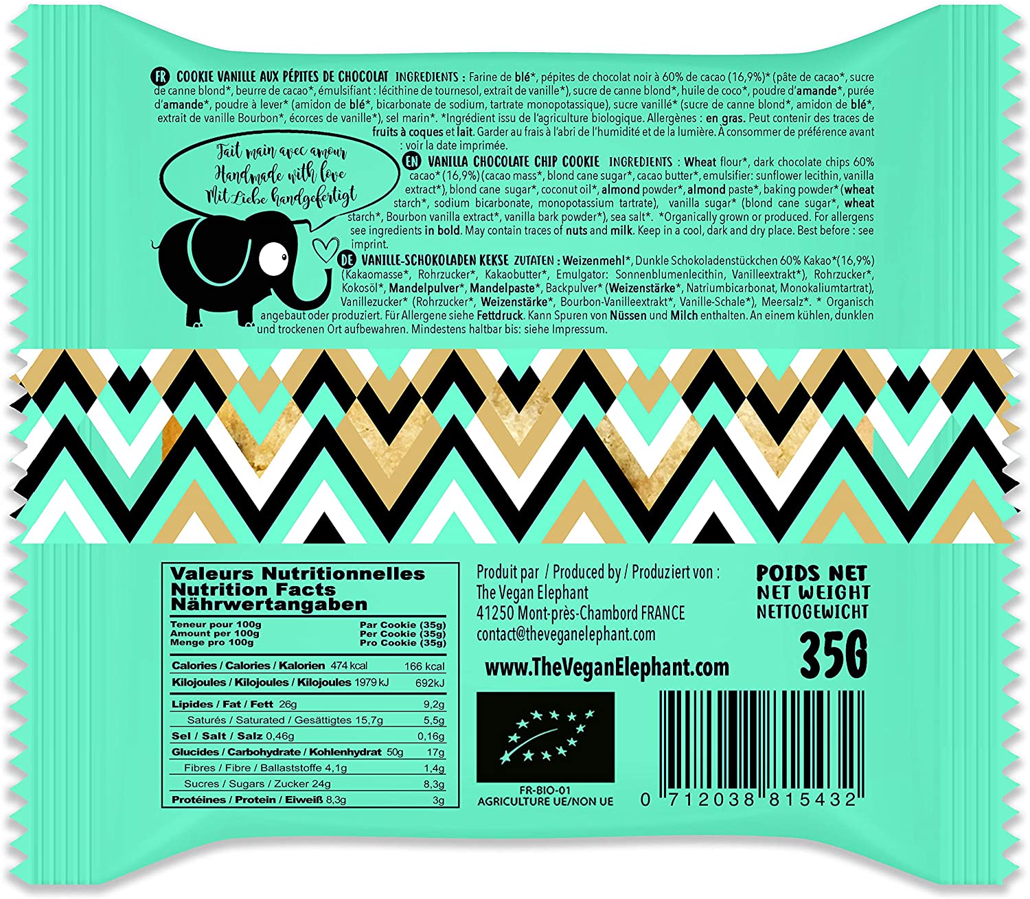 The Vegan Elephant Cookies sont issus d'une fabrication artisanale à partir d’ingrédients 100% Bio & Véganes de la plus haute qualité, choisis avec le plus grand soin, sans huile de palme ni OGM. Nous utilisons de la farine française de 1ère gamme, du sucre blond de canne, du chocolat noir supérieur, des amandes sous diverses formes, de l’huile de noix de coco des Philippines, de la vanille de Madagascar, une pointe de sel de Méditerranée et une touche de poudre à lever pour des cookies plein de saveur et de légèreté.
